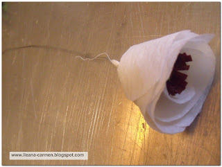 Se rasucesc petalele peste sarma si apoi se leaga cu ata sau se lipesc cu aracet.