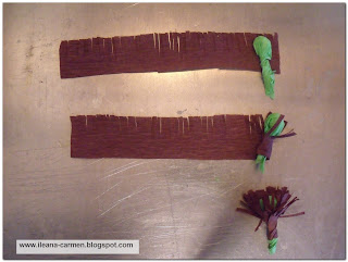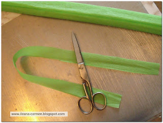Pentru stamine, se taie o banda de hartie creponata de dimensiuni (4 x 15) cm.