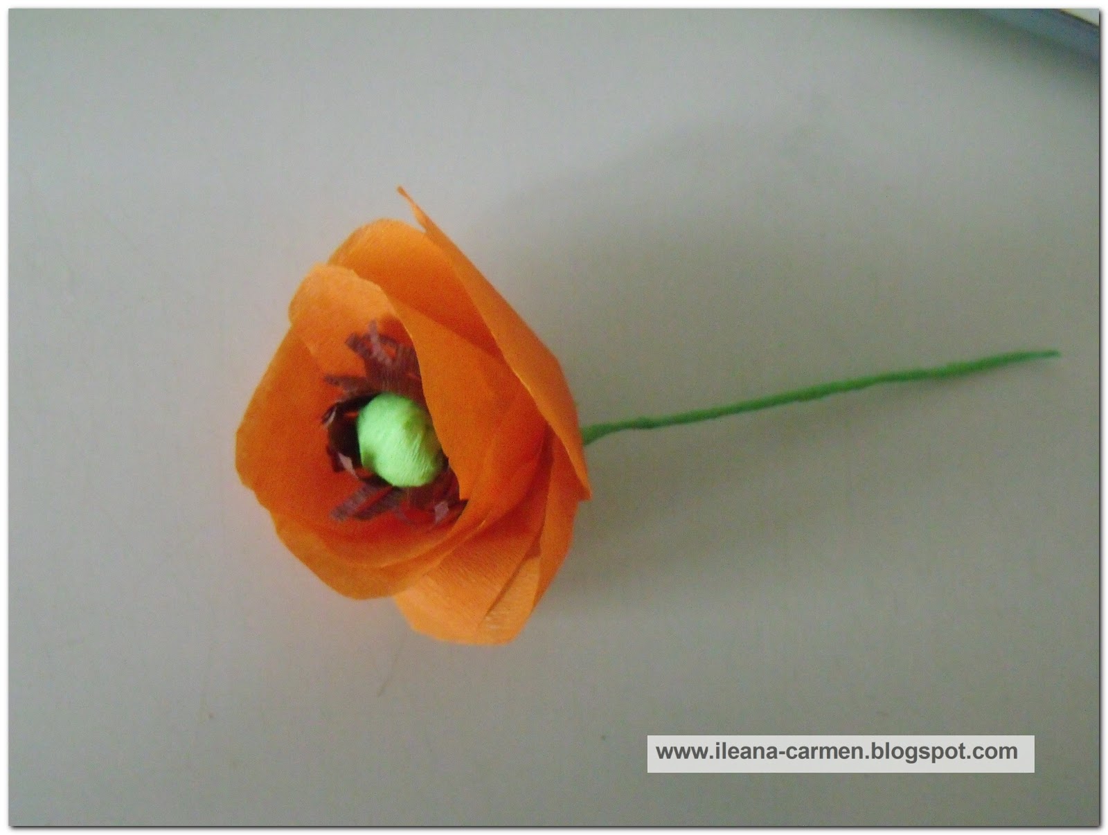 Taiati o fasie de hartie creponata verde de dimensiuni (1 x 25) cm si inveliti fiecare sarma cu hartia creponata si la capatul de jos lipiti cu lipici pentru a realiza tulpina florii de mac.